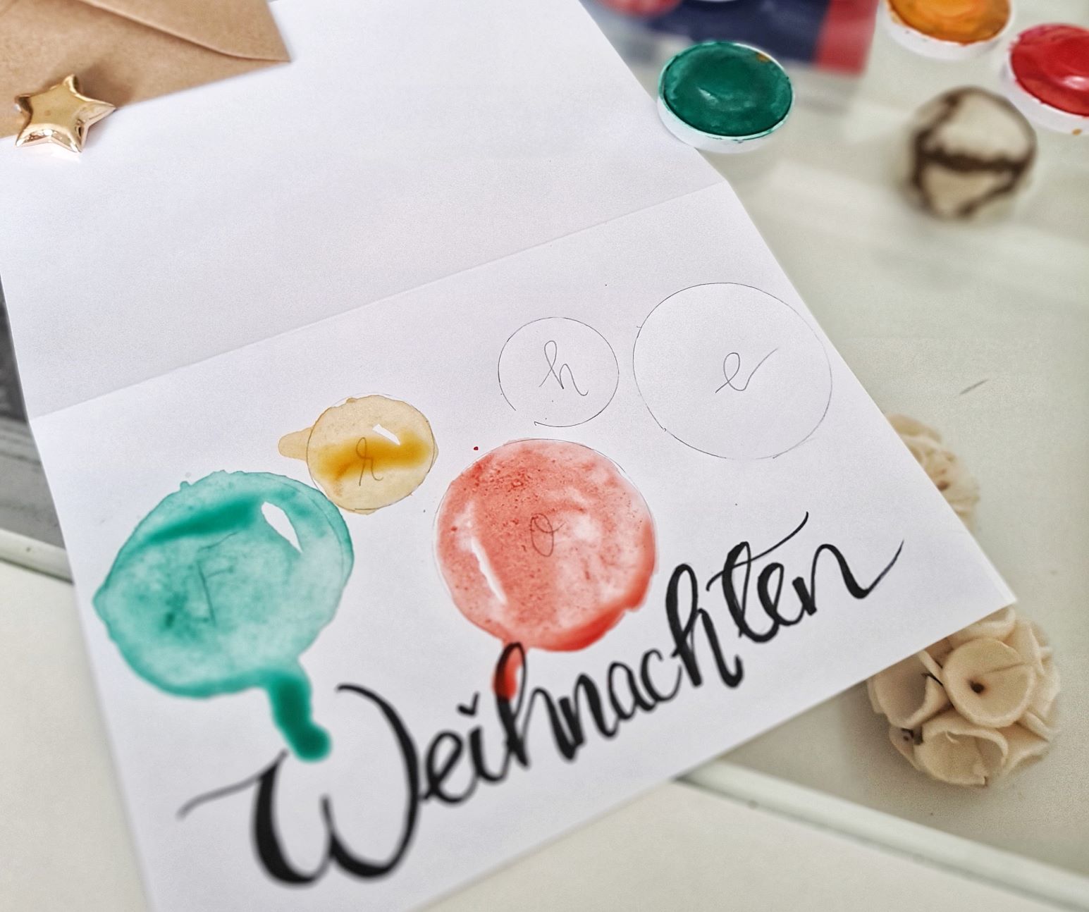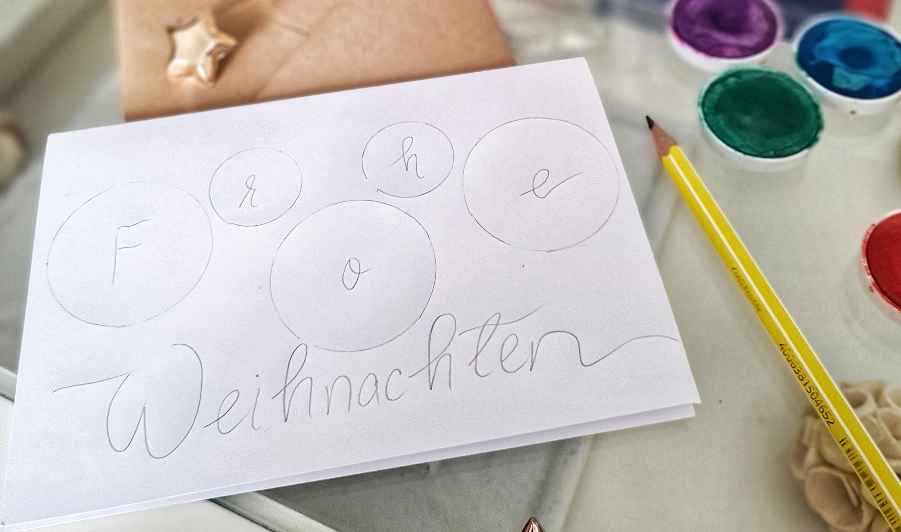 7. Sobald alles getrocknet ist, zieht den Text und die Kreise mit einem Fineliner nach. Wenn ihr Kalligrafie-Equipment habt, dann verwendet es. Falls nicht, dann haben wir mit anderen dünnen Finelinern ganz gute Erfahrungen gemacht.
