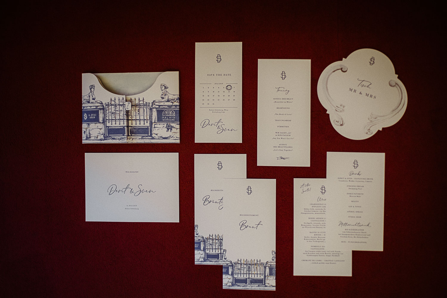 Für die Einladungen, Menükarten und sonstigen Drucksorten entschieden sich D+S für die elegante Letterpress-Variante. Dabei wird jede Drucksorte eigens designed und von Hand erstellt. Der Wunsch war, die Location in den Fokus zu bringen und als Zeichnung auf der Vorderseite der klappbaren Einladung zu sehen. Beim Aufmachen der Einladungskarte sollte man schon einen Einblick in das Look and Feel der Hochzeit bekommen. Bei Carissimo Letterpress wurden die Ideen des Brautpaares mit Liebe zum Detail umgesetzt und das Ergebnis kann sich nur sehen lassen.