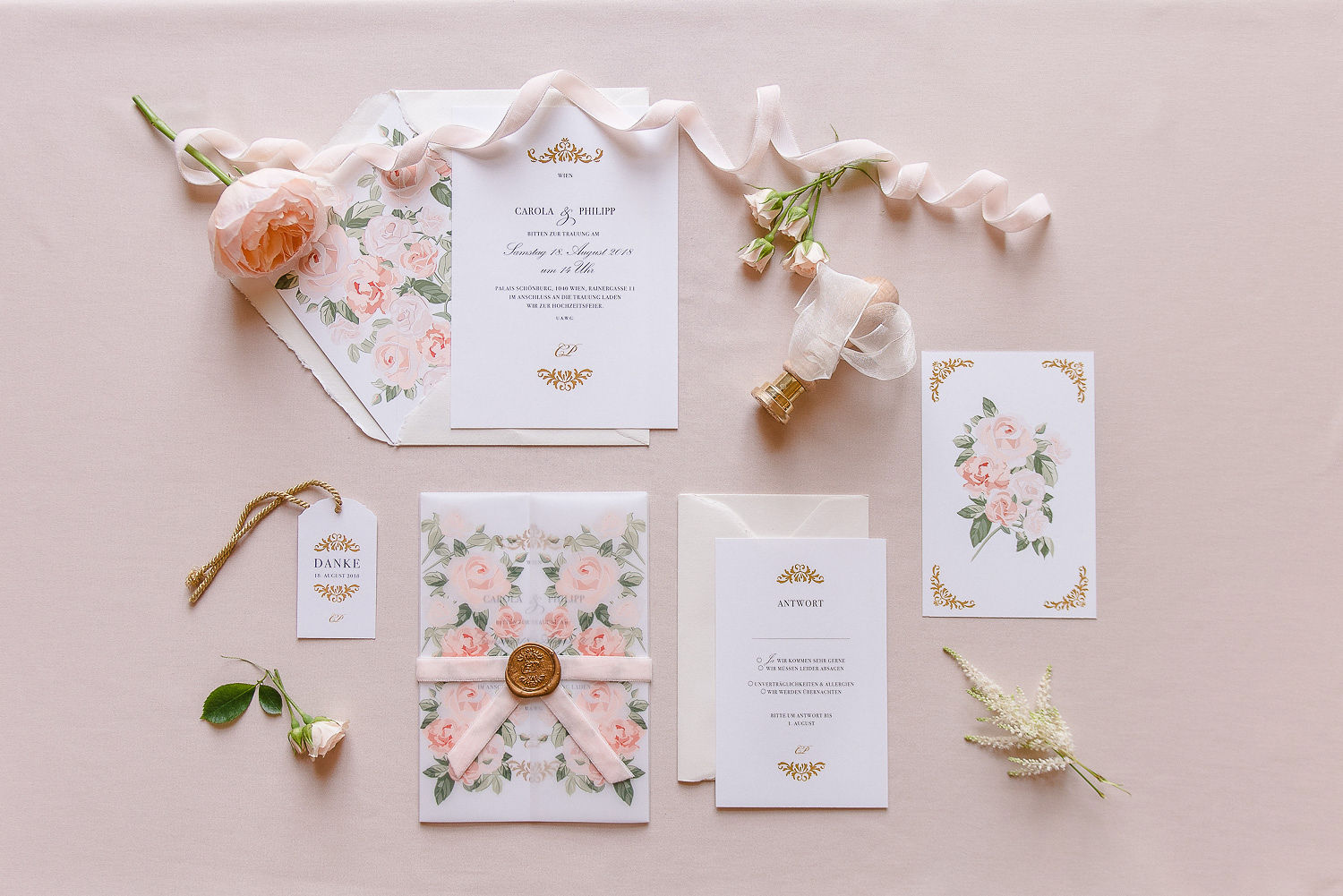 Die Hochzeitspapeterie von Christine Pleyl / XTINE Papeterie Wien zeigt bereits bei der Einladung einen Vorgeschmack auf das Hochzeitsthema und passt perfekt zu unserem eleganten Design. Die zarten Blumen sind von Hand illustriert. Fine Art Papier in Kombination mit Transparentpapier, ein individuell angefertigtes Wachssiegel und die eleganten Bänder sind sorgfältig aufeinander abgestimmt.