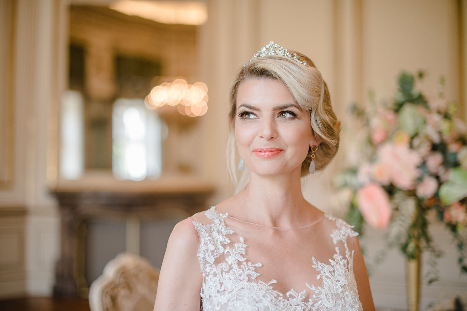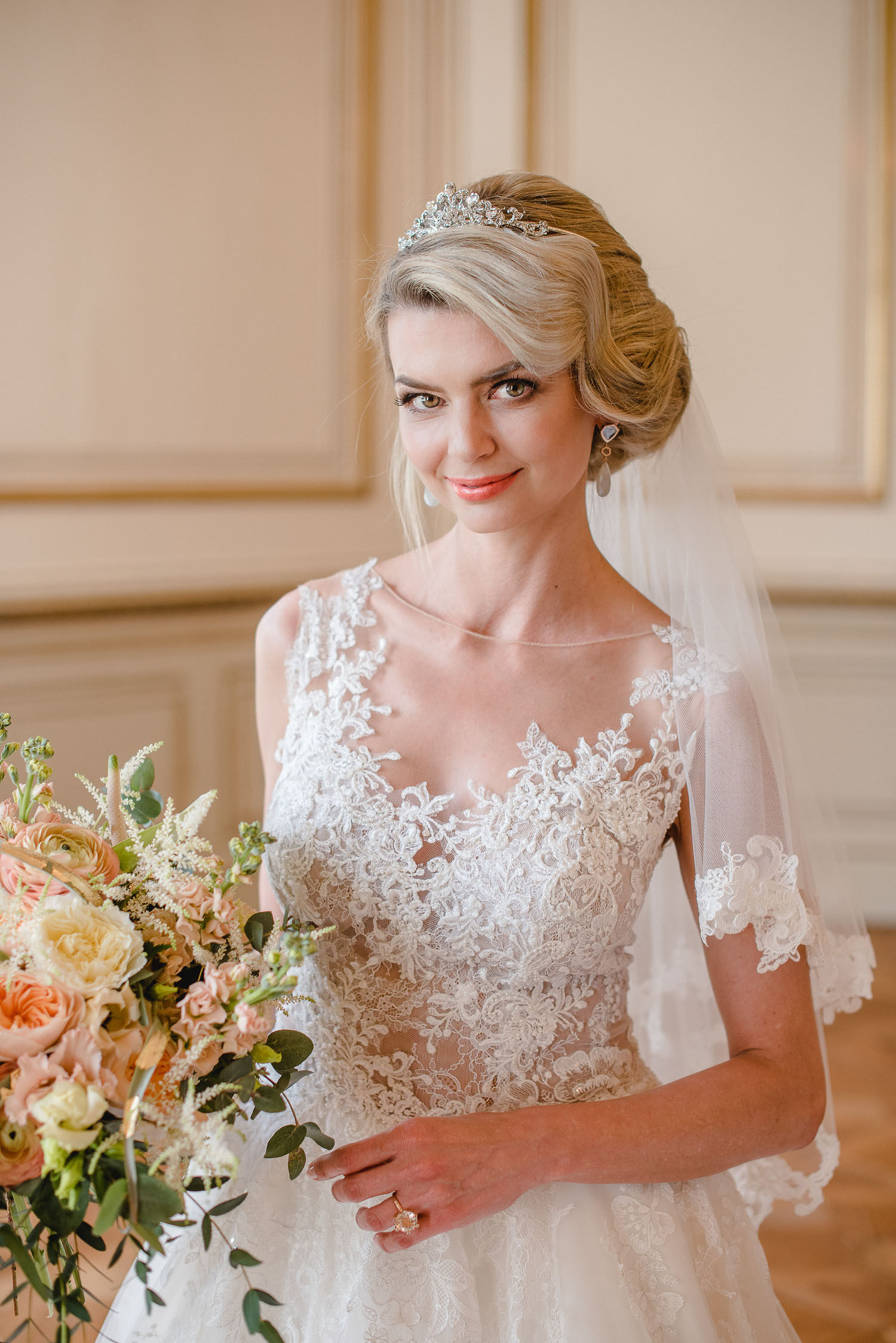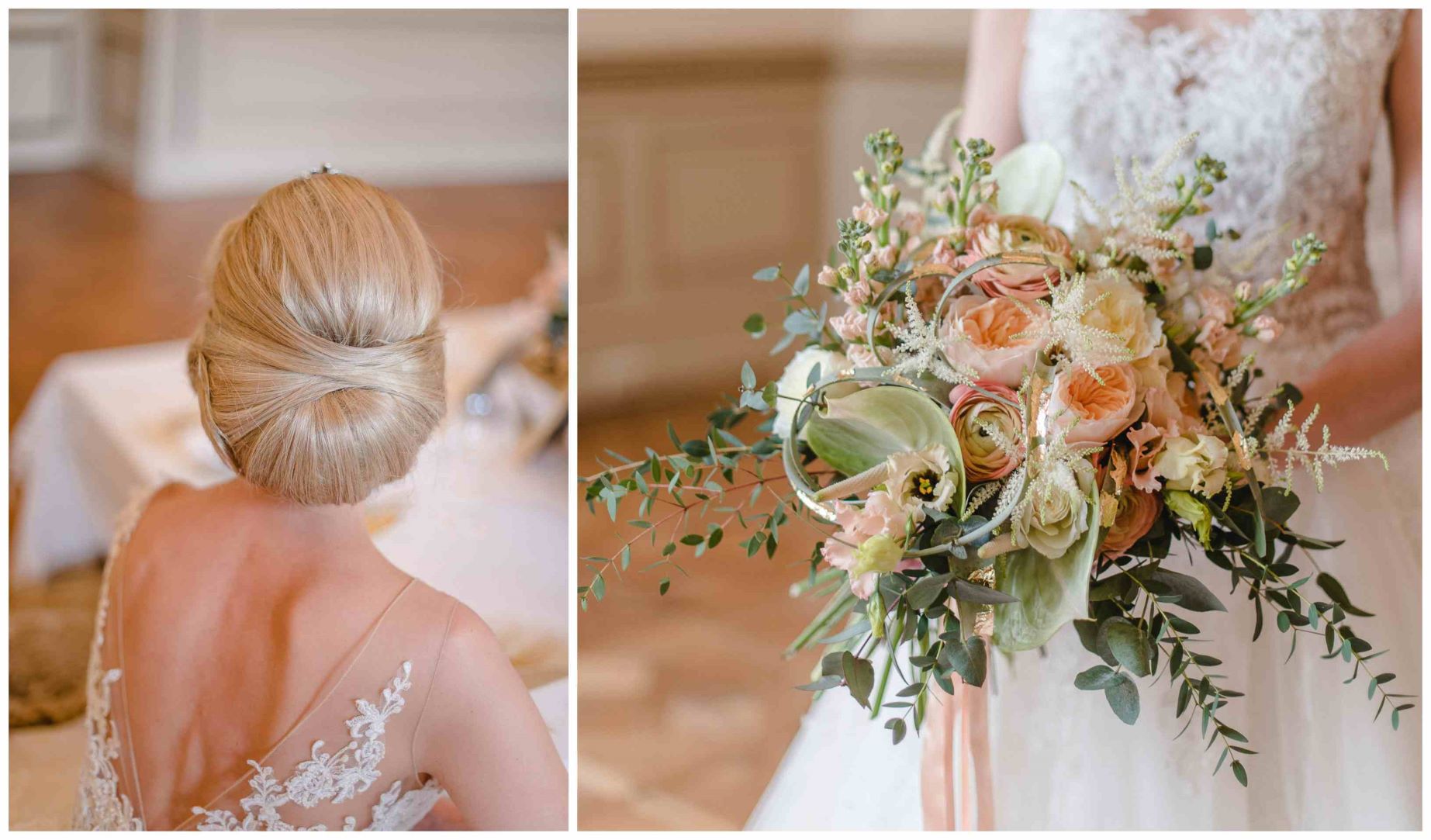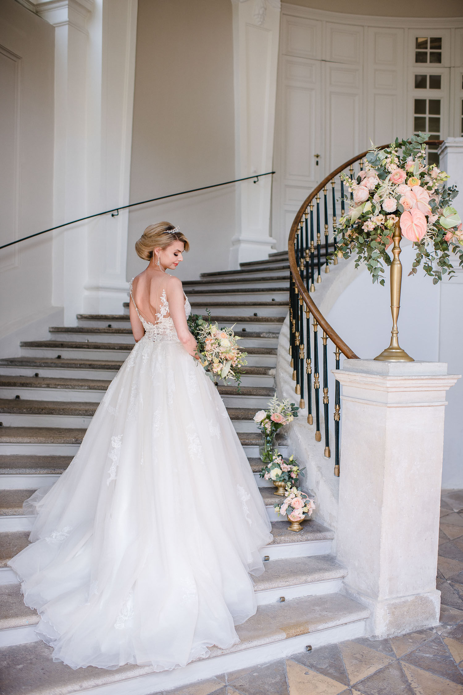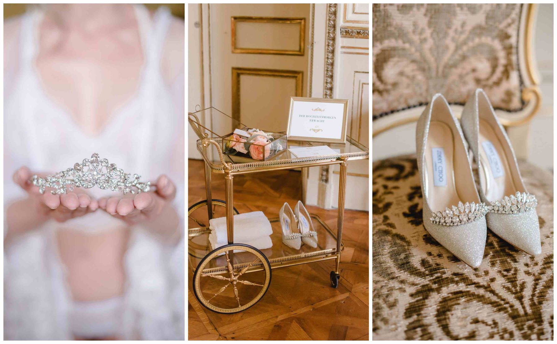 Das elegante Brautkleid mit Spitzendetails von Brautsalon Flossmann kombiniert die Braut mit einzigartigen Highheels von Jimmy Choo by STEFFL The Department Store. Das glamouröse Haar- und Makeup-Styling von Sawsan Babolleh lässt unsere Braut erstrahlen und verleiht ihr eine königliche Anmutung. Der passende Schmuck kommt von Alja&Friends, die Juwelen wurden alle handgefertigt.