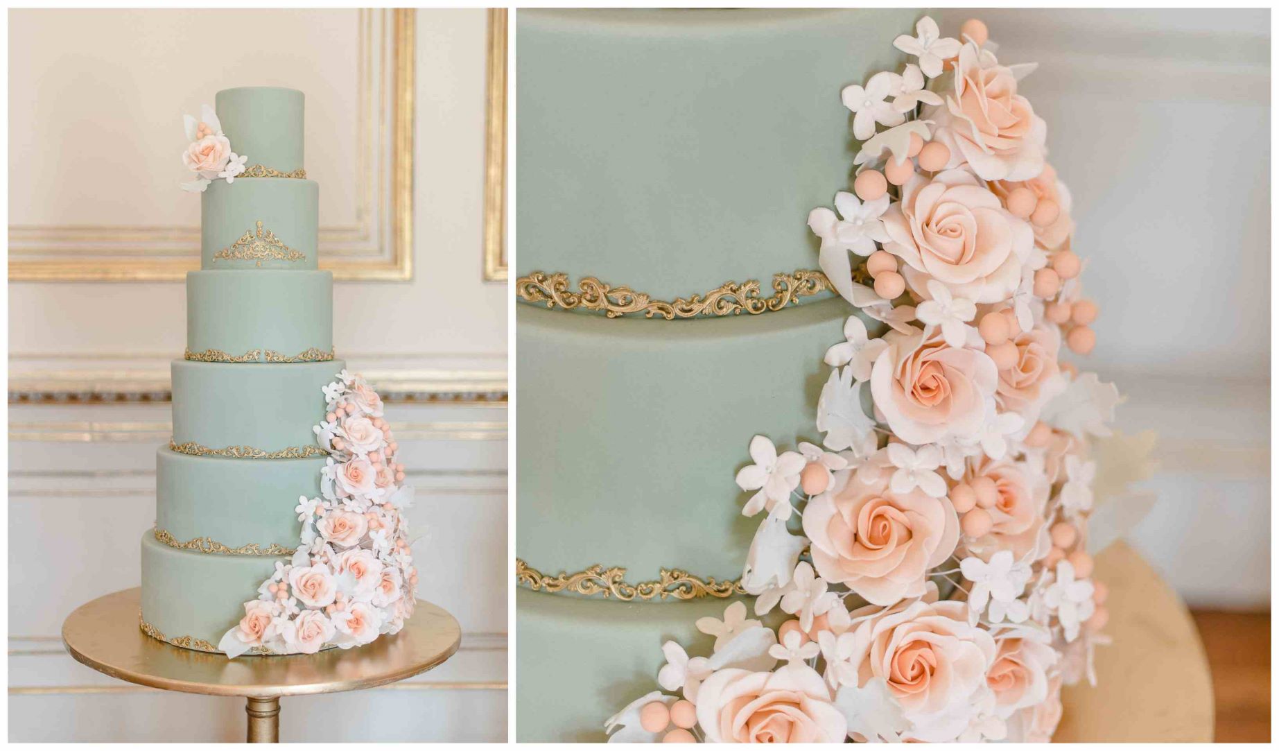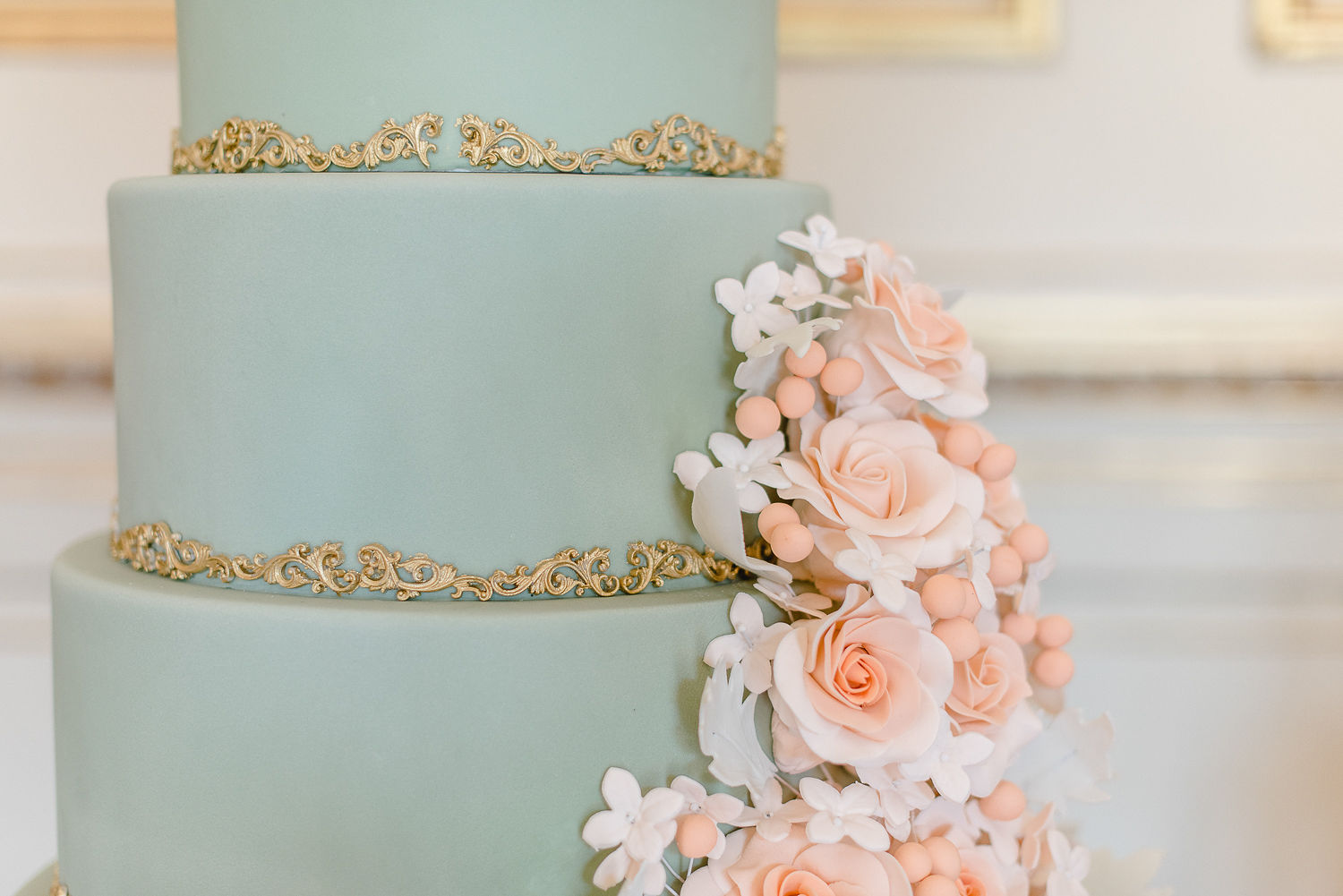 Die barocken Elemente wiederholen sich in der Hochzeitspapeterie genauso wie auf der außergewöhnlichen Hochzeitstorte mit handgefertigten Blumen von Christina Krug / Schnabulerie.