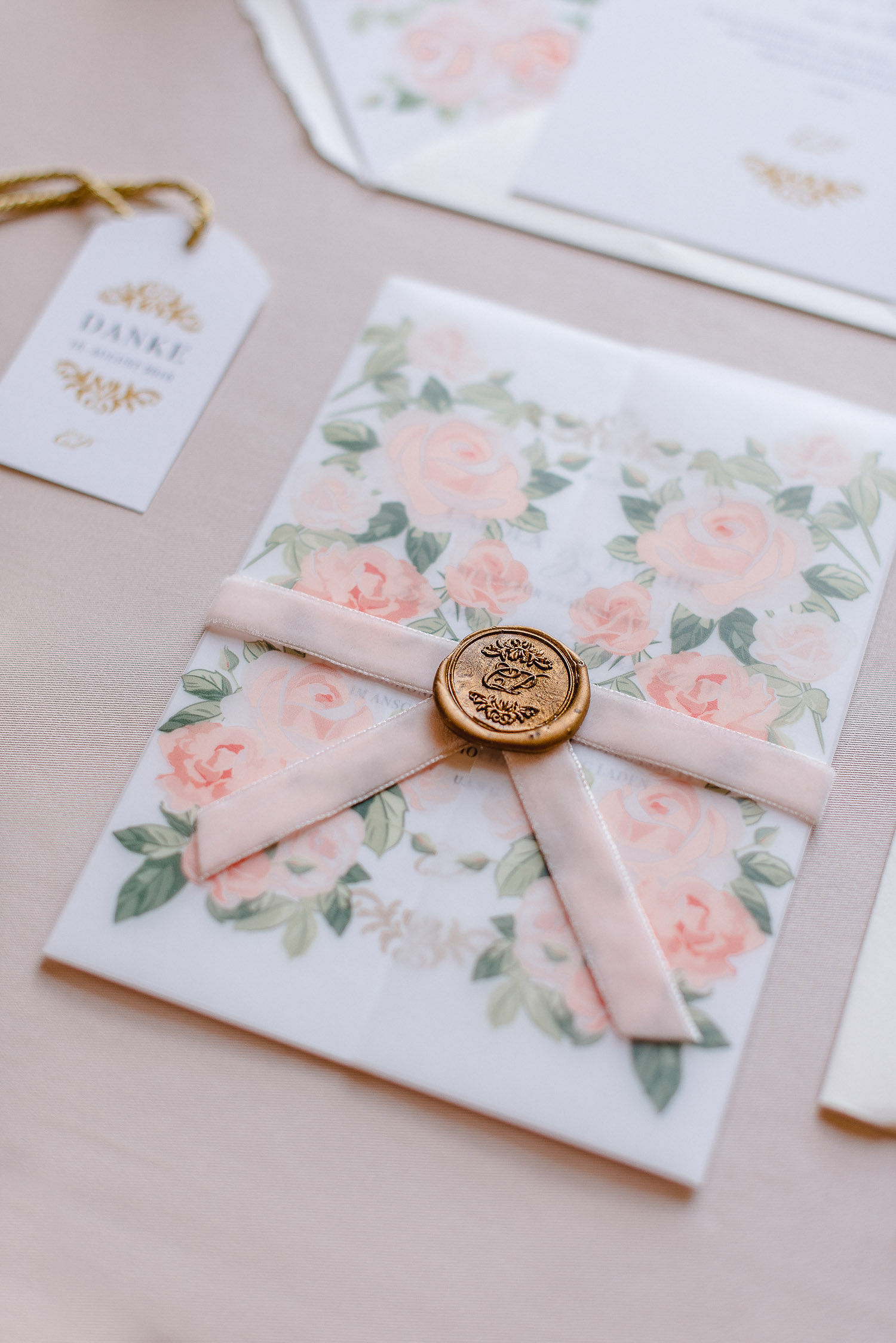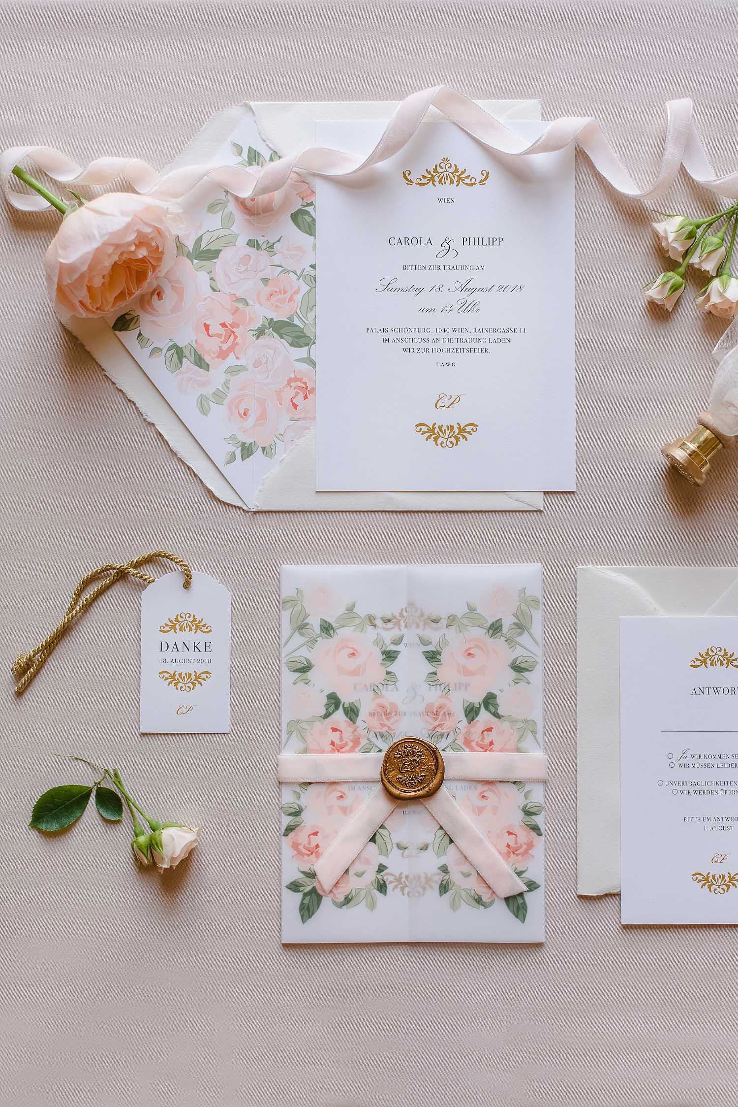 Die Hochzeitspapeterie von Christine Pleyl / XTINE Papeterie Wien zeigt bereits bei der Einladung einen Vorgeschmack auf das Hochzeitsthema und passt perfekt zu unserem eleganten Design. Die zarten Blumen sind von Hand illustriert. Fine Art Papier in Kombination mit Transparentpapier, ein individuell angefertigtes Wachssiegel und die eleganten Bänder sind sorgfältig aufeinander abgestimmt.