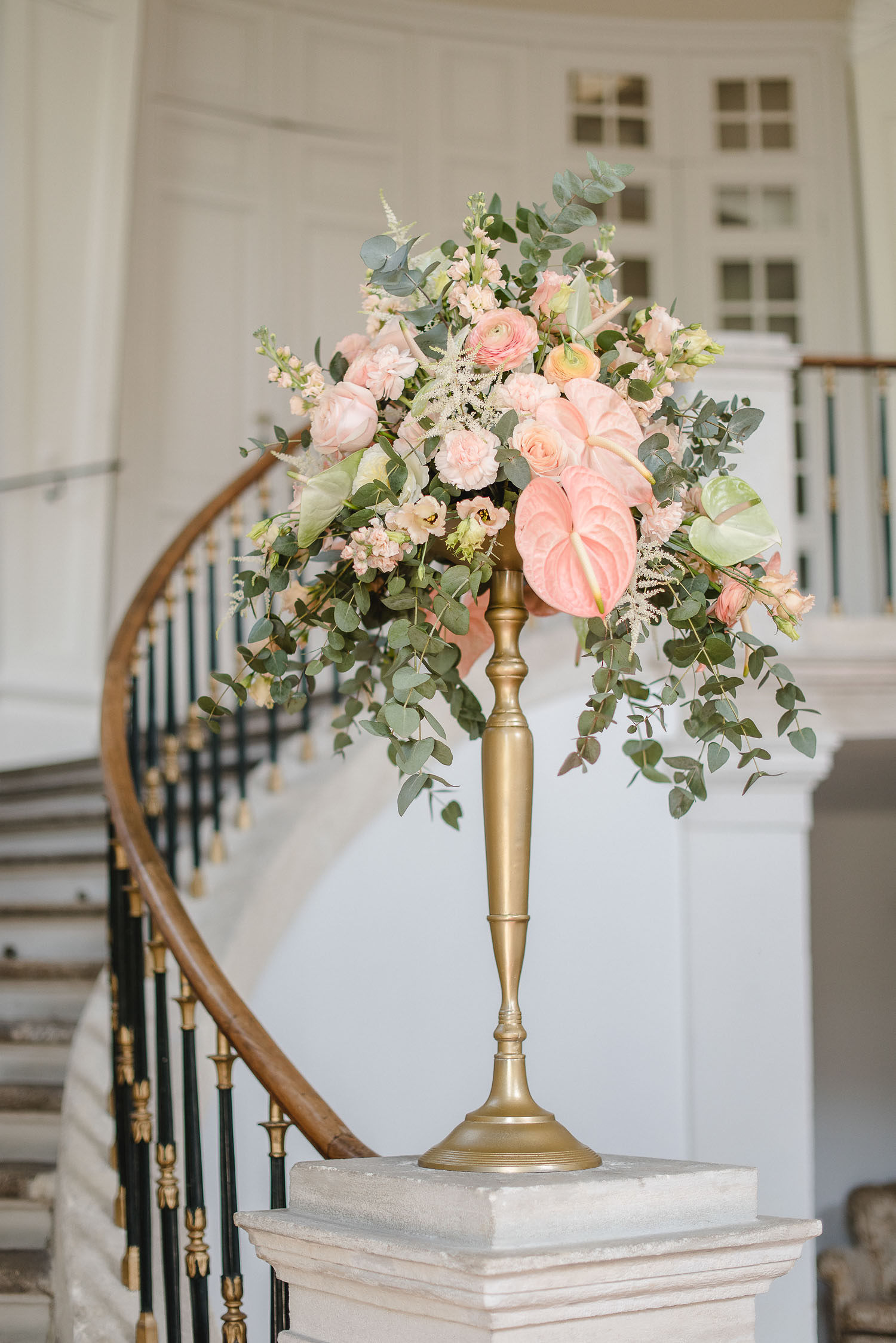 Ausgehend von unseren Hochzeitsfarben hat Ilvira / Ilviras Blumen ein außergewöhnliches Tischgesteck und einen opulenten Brautstrauß mit Anthurien, englischen Rosen und Ranunkeln kreiert.