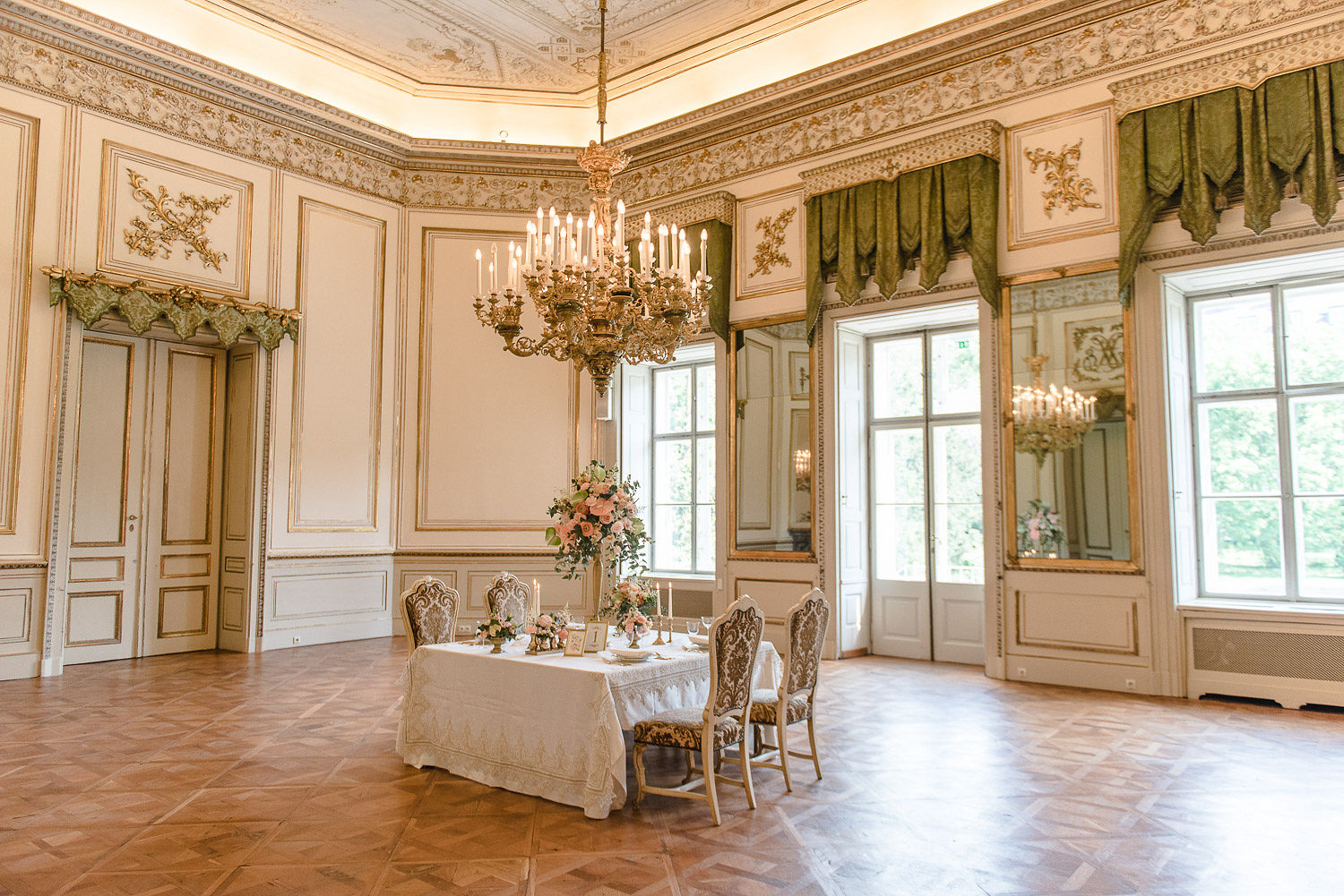 Die altehrwürdigen Wände des Palais Schönburg bieten den perfekten Rahmen für unsere Hochzeitsinspiration. Der beeindruckende Festsaal mit hoher Decke und dem spektakulären Kristallkronleuchter macht den Ort perfekt als Hochzeitslocation.