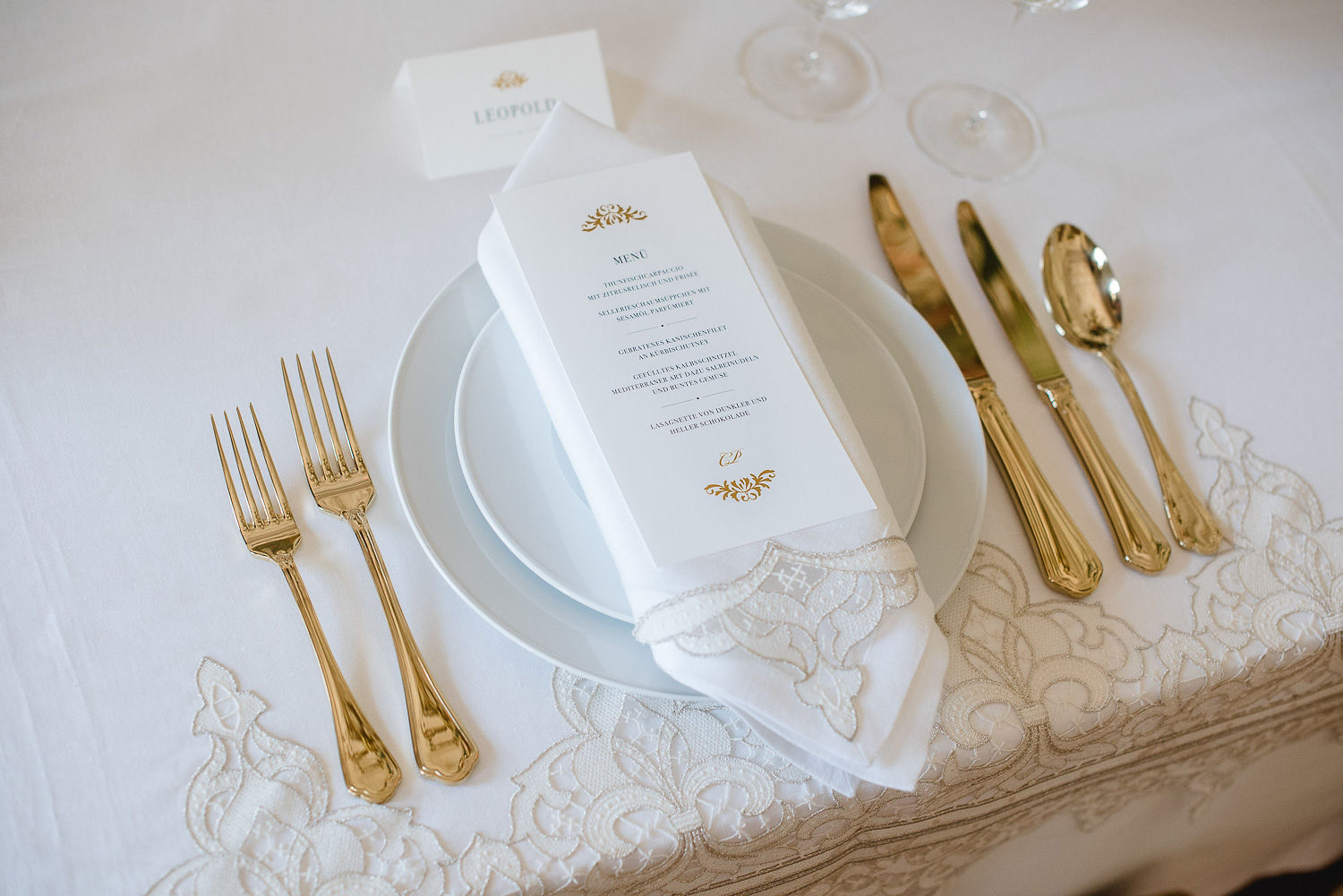 Feinstes Tafelleinen von der weltbekannten Wiener Manufaktur „Zur Schwäbischen Jungfrau“ in Kombination mit zauberhaftem und erstklassigem Glas- und Tafelgeschirr von Lobmeyr komplettieren unsere Tafel für einen glamourös-unvergesslichen Hochzeitstag.