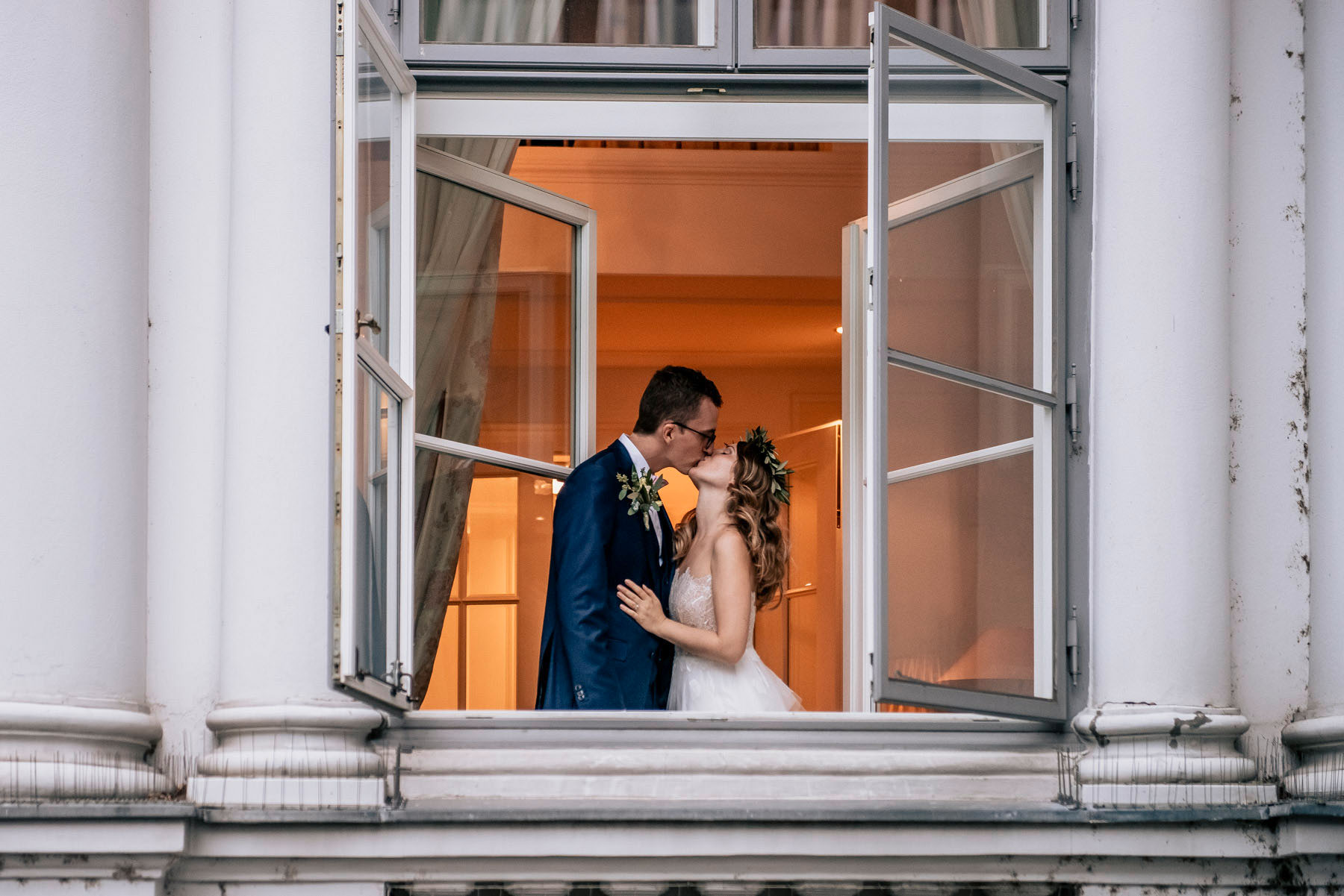 Im Palais Coburg angekommen gab es erstmal einen Empfang für alle Gäste. Damit die gute Laune und Feierstimmung keinen Abbruch findet, heizten Viktor und Chris von Weiss und Kranics den Gästen mit Gute-Laune-Liedern und Hits zum Mitsingen ein. Dass tatsächlich getanzt wurde, war sicherlich den polnischen Wurzeln der Braut zu verdanken, wo das Tanz vor dem Essen keine Seltenheit ist. Die Band hatte das Brautpaar Monate davor zufällig in einer U-Bahn-Station auftreten gesehen. Sie waren so begeistert von der Performance der Musiker, dass sie das Duo glatt für ihre Hochzeit engagierten – also wenn das nicht urban living ist!